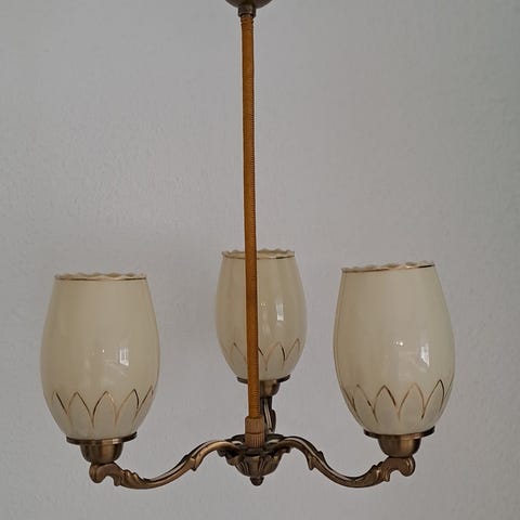 Myydään 6-haarainen messinkikruunu. Valaisimessa on kauniisti patinoitunut messinkirunko, pallo-osa pohjassa ja alkuperäinen koristeellinen hapsutupsu varressa. Ikäisekseen todella hyvä ja siisti. Messingissä on hieno, tasainen patina.