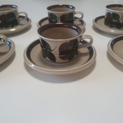 Täysin ehjät Arabia Puljonki liemilautaset aluslautasineen. Liemilautasissa leima 12-67 ja aluslautasissa 1-64.