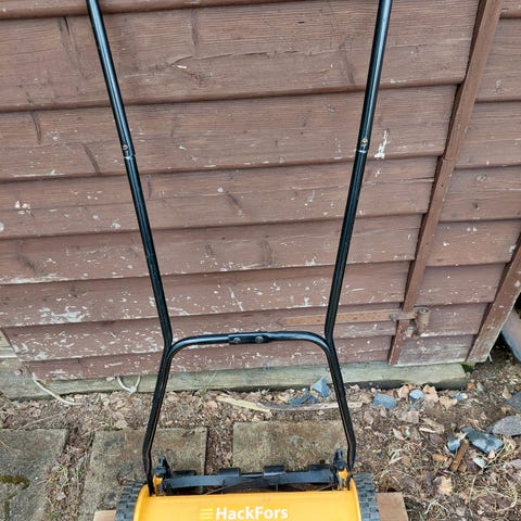 Brüche käsikäyttöinen kelaleikkuri. Leikkurissa on mekaaninen kelaterästö ja suuret pyörät, jotka pyörittävät teriä työnnön voimalla. Sopii nurmikon leikkaamiseen ilman sähköä tai polttoainetta. Runko ja työntöaisa ovat metallia, leikkuuyksikkö ja suojakotelo muovia ja metallia. Soveltuu pihan ja puutarhan nurmialueiden hoitoon.