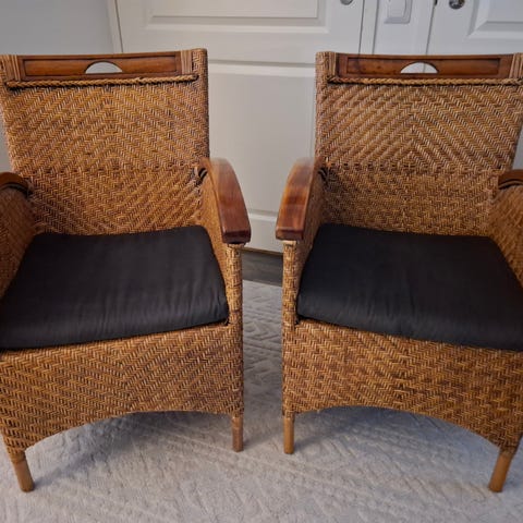 Kolme rottinkituolia. Kahdessa punokset irronneet (kuvat), muuten hyvässä kunnossa. Vika siis kosmeettinen. Korjaussarja mukaan. Helppo korjata. Itse en jaksa, koska kissa repii kuitenkin. Siksi myyntiin.