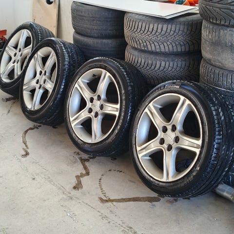 Vanteet isolla keskireiällä, joten sopivat taatusti moneen 5x114.3 (ja varmaan 5x115) jakoiseen autoon. Yksi paikallaan olevista soviterenkaista puuttuu, mutta sellaisen saa tilattua esimerkiksi Kärkkäiseltä tai Vannetukulta.