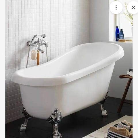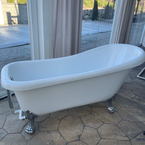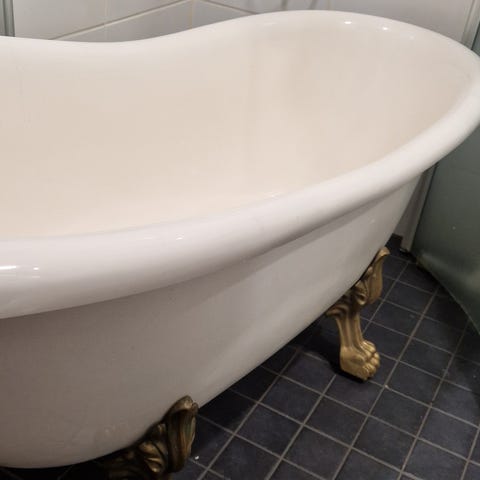 Valkoinen tassuamme hopeilla tassujaloilla. Ammeessa kaksi reikää hanalle. Joitakin naarmuja ja pintalikaa löytyy, varmasti suurin osa lähtee putsaamalla. Tulppa puuttuu. Korkeus n. 80cm korkeimpaan kohtaan, pituus 155cm.