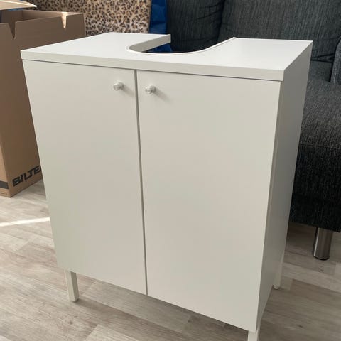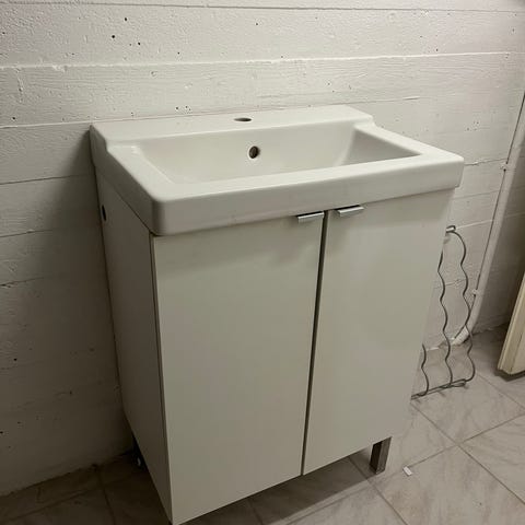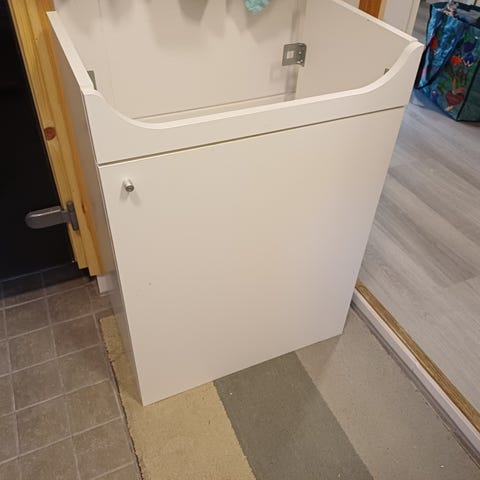 Hyväkuntoinen allaskaappi. Kaapiston ovien värinä puunsyitä jäljittelevä valkosaarnilaminaatti. Leveys 60cm, syvyys 50cm ja korkeus 63cm. Toki kun seinään kiinnitetään, niin saa haluamaan korkeuteen. Pohjassa vanhoille putkille tehty muutama reikä. Jäi tarpeettomaksi, kun haluttiin leveämpi kaapisto nykyiselle paikalle, kunnon puolesta ei vaihtotarvetta ollut.