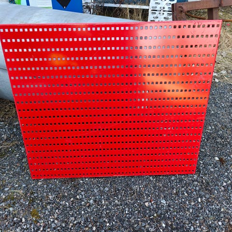 Pinnassa näkyy ruostejälkiä ja kulumaa. Soveltuu esimerkiksi seinälevyksi, säilytys- tai kiinnityspinnaksi työpajaan, varastoon tai muuhun tilaan, jossa tarvitaan rei’itettyä metallipintaa koukkujen tai muiden kiinnikkeiden käyttöön.