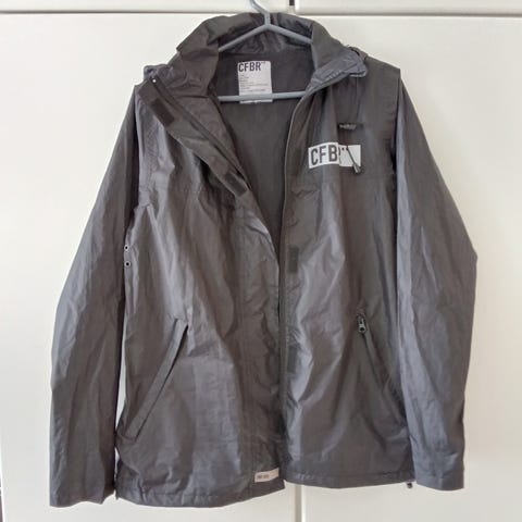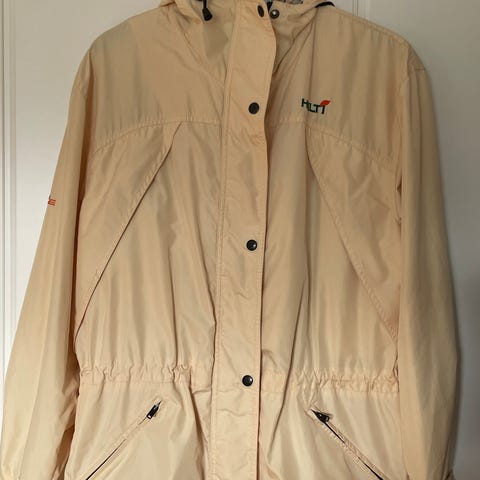 Vastaa hyvin kokoaan 38 (reilu S tai pienehkö M). Huppua ja helmaa voi kiristää, tuuletusaukot kainaloiden alla ja vetoketjutaskut edessä.