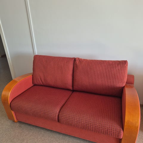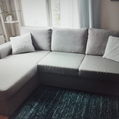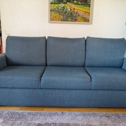 Iskusta ostettu vuodesohva, ollut vieraiden käytössä. Hyväkuntoinen, muutamassa kohdassa jälkiä, niistä lisäkuva.