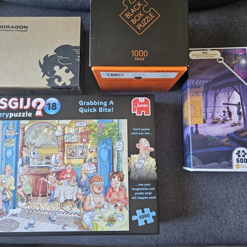 Uutena ostetut ja vain kerran kootut ja puretut 1000 palan Wasgij? mysteeripalapelit.