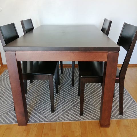 Myydään Kotisiilistä ostettu laadukas lankkupöytä ja Ikean Henriksdal tuolit (4kpl). Myydään mielellään pakettina. Tuoleissa on irrotettavat harmaat päälliset. Koko setti hankittu noin 4 vuotta sitten, mutta on yhä hyvässä kunnossa. Pöytä miltei moitteeton kunnoltaan. Pöydän mitat 140cm x 90 cm x 73 cm.