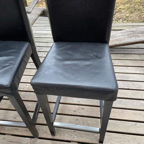 Myydään korkeat ruokapöydän tuolit/baarijakkarat (2kpl). Valkoisella keinonahkapäällisellä ja metallijaloilla.