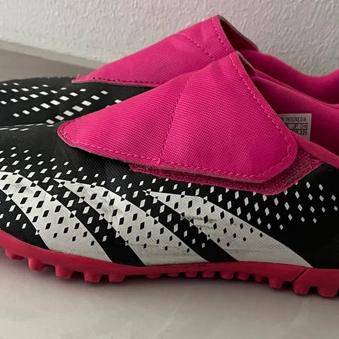 Koko 36 (EU). Väri vaalea/valkoinen sinisillä yksityiskohdilla. Nappulapohja on tarkoitettu luonnonnurmelle tai keinonurmelle. Kengissä on nauhakiinnitys ja matala varsi, joka tukee nilkkaa. Vain nouto.