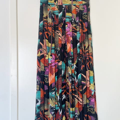 Kangas on kaunis, vähän kiiltävä. Ruusut on kuin printattu tummalla päälle. Kauniita yksityiskohtia yläosassa. Hameessa on vuori sekä nappi ja vetoketju.