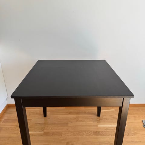 Myyntiin Jyskin ruokapöytä jossa valkoinen levy ja puun väriset jalat.