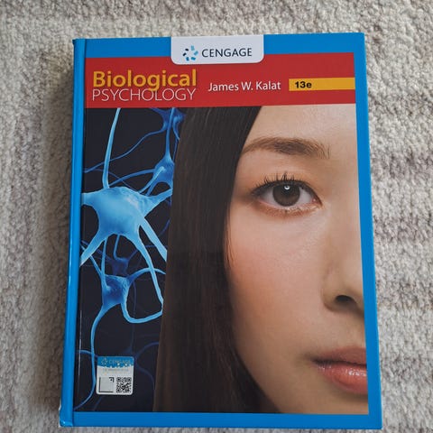 James W. Kalat Biological Psychology -oppikirja, 8. painos, kovakantinen. Ei merkintöjä, ainoa puute takakannen liimauksen irtoaminen sisäpuolelta. Teos soveltuu erityisesti psykologian ja kasvatustieteen opintoihin sekä muille käyttäytymistieteiden aloille. Mukana on Exploring Biological Psychology -CD, joka sisältää lisämateriaalia kirjan aiheisiin liittyen.