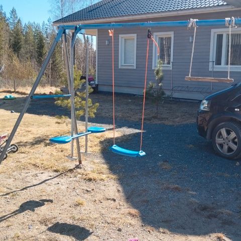 Jo iäkkäät, mutta toimivat pihakeinu ja pikkuinen hiekkalaatikko mukaan samaan hintaan. Vain nouto kivistöstä. Keinuun kiinnitetty vahvat puutukit jalkoihin, jotka saa halutessaan mukaan.