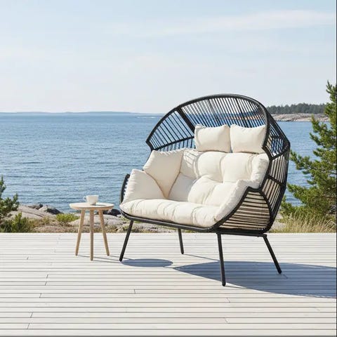 Sen avoin, kudottu pesämäinen muotoilu luo viihtyisän ja suojaisan oleskelupaikan terassille, parvekkeelle tai puutarhaan.