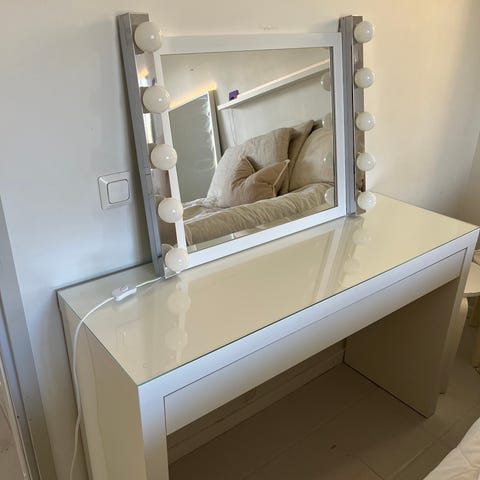 Myydään settinä peilistoren PsLight Makeup Mirror SANNI 800 x 650mm meikkipeili valoilla (359,90e ovh), igloon läpinäkyvä tuoli (noin 100e ovh) sekä valkoinen korkeakiiltoinen pöytä kahdella vetolaatikolla (ilmeisesti poistunut malli Ikeasta, samankaltaisten hinta 129e)