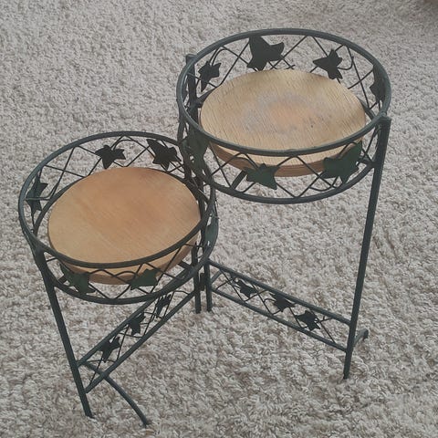 Myyn kuvien rautalankaisen kukkatason.