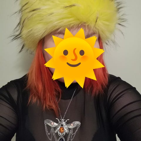 Sinapinkeltainen hattu nauhalla.