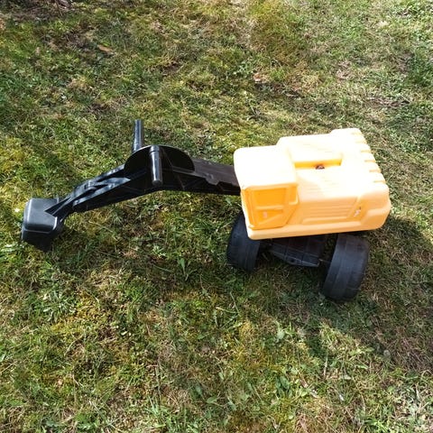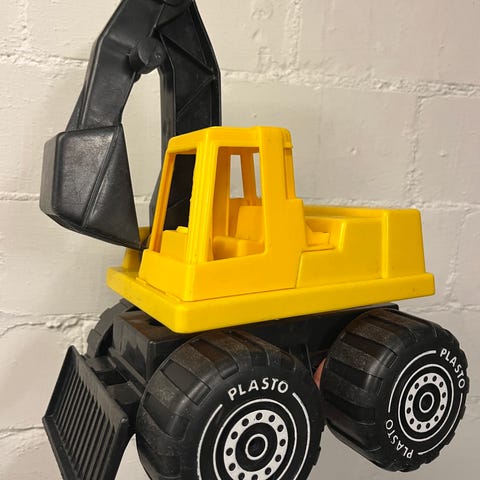 Uusi Plasto iso lelu kaivinkone. Keltainen muovinen kaivinkone, jossa on musta liikkuva puomi ja kauha sekä neljä pyörää. Sopii hiekkaleikkeihin ja sisäleikkeihin lapsille. Muovimateriaali on kevyt ja helppo puhdistaa käytön jälkeen.