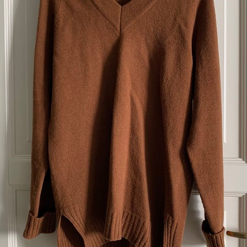 Merinovilla poolopusero värissä poltettu oranssi. Väärän koon vuoksi vain muutamasti käytetty. Kai-kai 50 cm, olka-helma 68 cm.