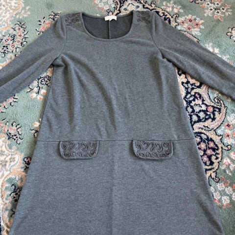 Creamin kiva mekko. Kainalo-kainalo n. 50 cm, joustaa hieman. Olka-helma n. 102 cm. Yläosa ja hihat sifonkia. Pieni langannousu edessä, muuten erittäin siisti.