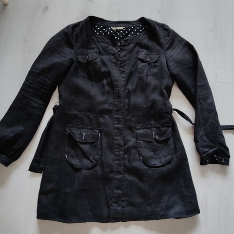 Naisten musta vuorellinen pellavatakki. Hartioissa pieni rypytys, etupuoli röyhelöinen. Per Una merkkinen ja kokomerkintä 14, joka vastaa kokoa L. Nouto.