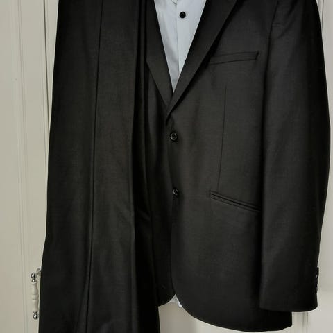 Hyväkuntoiset juhlavaatteet. Puvunhousuissa säädettävä vyötärö. Kauluspaita valkoinen ja solmio musta.