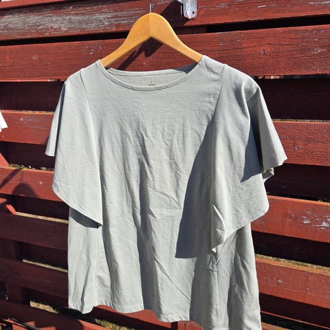 T-paidassa on kauniit perhoshijat, jotka tuovat paitaan hienon särmän. Ostettu Mujista noin vuosi sitten.