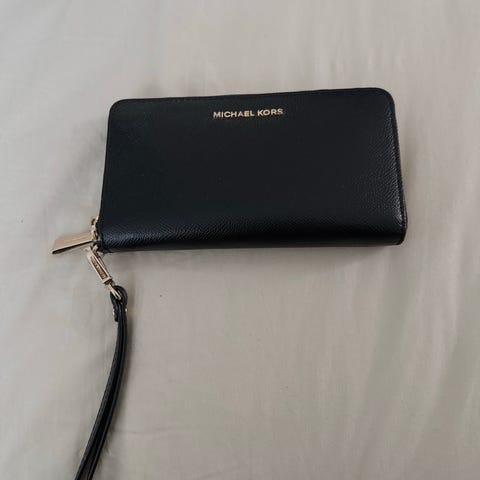 Michael Kors nahkainen naisten lompakko. Lompakko on mustaa nahkaa ja siinä on vetoketjusuljenta. Etupuolella on Michael Kors -logo. Sopii käteisen, korttien ja pienten arki tarvikkeiden säilytykseen.