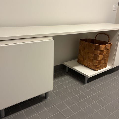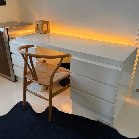 Kiiltävä valkoinen Muuramen ohut Ällä työpöytä. Laatikosto ylimmässä laatikossa jokin pieni ongelma, avautuu ja sulkeutuu hieman tahmeammin kuin alempi laatikko. Voi olla että korjaantuisi helposti, en ole itse yrittänyt selvittää missä vika. Muutoin hyvässä kunnossa. Näppärän kokoinen, sopii hyvin pieniinkin tiloihin.