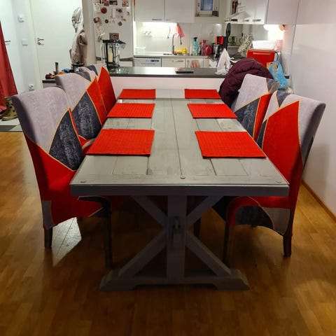 Pöydän ympärille mahtuu helposti neljä per sivu, kaksi päihin, yhteensä 12 henkilöä illalliselle.