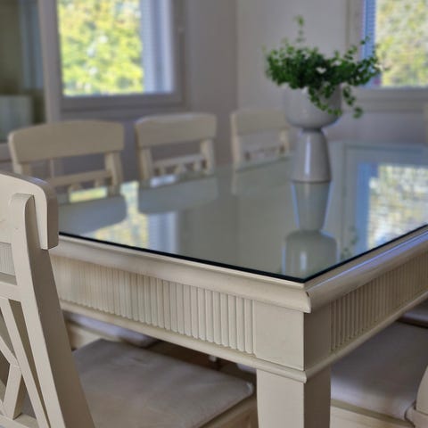 Upea ruokapöytä, Ruotsista design & sisustusliikkeestä ostettu ruokapöytä, kaunis kalanruotokuvioitu pinta, jossa laadukas paksu lasi päällä.