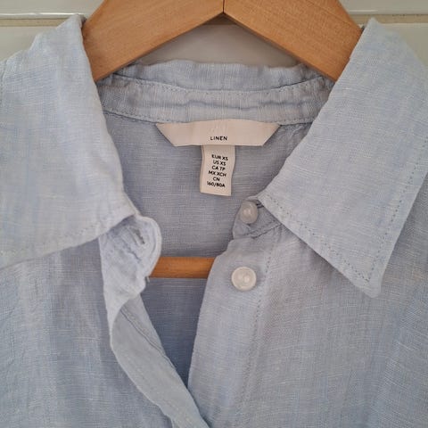 Tom Tailor tummasininen 100% pellavapaita / pusero, reilu koko 34. hihat voi kääriä ylös ja kiinnittää napilla. Pituus 60 cm, ry 90 cm.