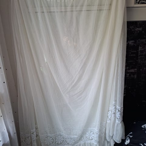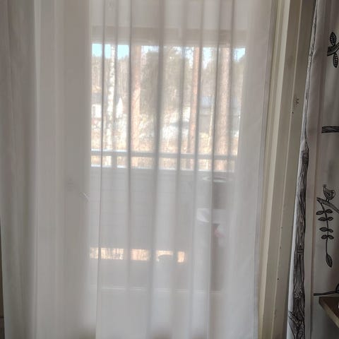 Beigen sävyiset valoverhot 2kpl. Verhon mitat noin 240cm x 110cm. Yläreunassa kuja verhotangolle. Siistikuntoiset!