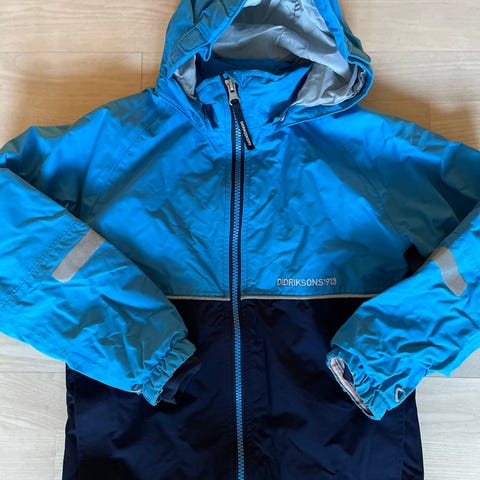 Didriksons lasten takki pojille, koko 120. Väri sininen ja materiaali polyesteri. Takissa on irrotettava huppu, ja hihat ovat pidennettävissä pari senttiä hihojen sisäpuolella olevan ompeleen avulla (emme ole sitä käyttäneet). vetoketjukiinnitys edessä sekä heijastinyksityiskohtia hihoissa. Sopii arkeen ja ulkoleikkeihin kolmena vuoden aikana, vedenpitävä kuoritakki. Ja ollut käytössä kaksi vuotta mutta edelleen siistissä kunnossa, muutamia pieniä kulumajälkiä löytyy.