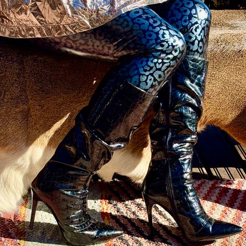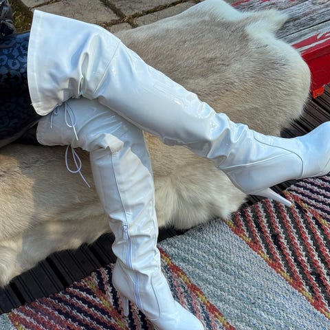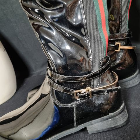 Myydään PVC-mustat kiiltävät latex saappaat. Uudet. Varren pituus 48cm, platform 5 cm, korko 14cm. Sisämitta 26cm