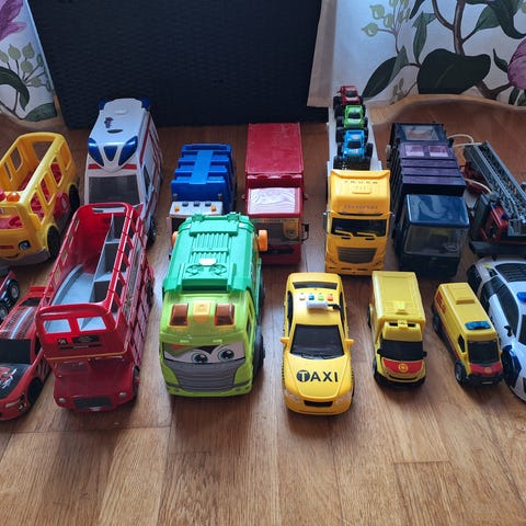 Myytävänä kasa leluautoja. Kaikki ehjiä. Osasta kuuluu ääniä ja joihinkin saa äänet kun vaihtaa patterit. En takaa, että kaikkien autojen äänet välttämättä toimii kun en ole testannut. Lisään pakettiin lisää saman kokoluokan autoja jos ja kun löydän kun siivoan kaappeja.