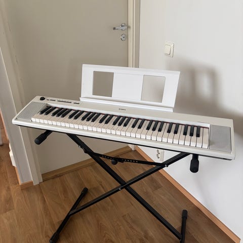 Yamaha kosketinsoitin. Soittimessa 61 koskitteminen koskettimisto ja useita säätimiä sekä näyttö keskellä ohjauspaneelia. Sopii esimerkiksi kotisoittoon, harjoitteluun ja säestyksiin. Mukana nuottiteline, joka kiinnittyy soittimen taakse, sekä Yamahan Sustain poljin.