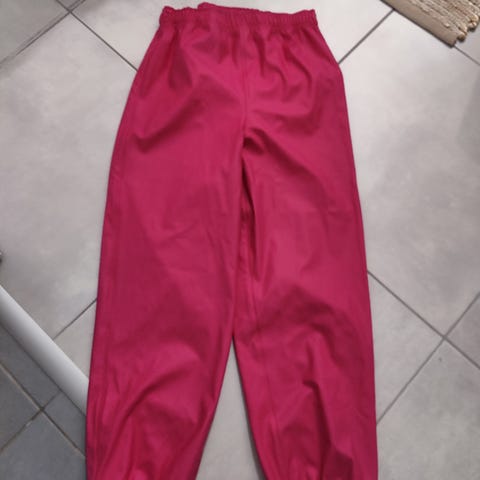 Pinkit henkselittömät sadehousut kokoa 140. Vyötäröllä säätökuminauhat, lahkeissa takana heijastimet. Jalkalenkit on ehjät. Polvissa ja pepussa vähän likaa. Käytetty vain muutamia kertoja, joten on hyvässä kunnossa.