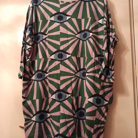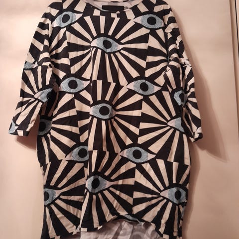 Vimma tunika. Koko one size. Materiaalina puuvilla. Mekossa on monivärinen, kirjava kuosi ja pitkät hihat. Sopii käytettäväksi arjessa tai rennommissa tilaisuuksissa. Huolto-ohjeet löytyvät vaatteen pesulapusta, kohta josta vahingossa vähän leikattu (kts. Kuva). Eläintalous