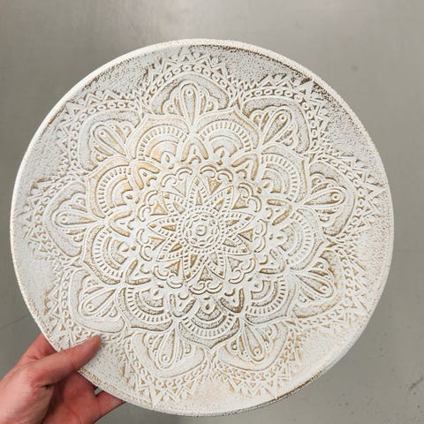 Myydään Stockmannilta ostettu pitsikuvioitu keraaminen lautanen. Lautasen halkaisija 33 cm ja korkeus 3,2 cm. Soveltuu vain koristekäyttöön. Lautanen on muuten priimakuntoinen, mutta reunasta on kerran irronnut palanen, joka on liimattu takaisin, ja jäljelle jäänyt pieni kolo on täytetty kitillä (ks. kuvat). Vika ei vaikuta käyttöön millään lailla. Pohjapuolen savenvärisessä "renkaassa" joitakin nirhaumia, jotka ovat olleet siinä aina. Ovh ollut 19,90 e.
