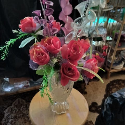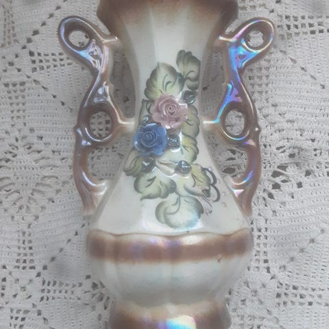 Ruskea rasia, jonka kantena on kimppu harmaita ruusuja, materiaali jokin massa (ei keraaminen).
