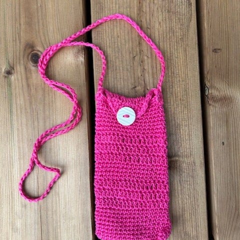 Vihreä-musta-valkoinen 'räsymatto'-virkattu puhelinlaukku