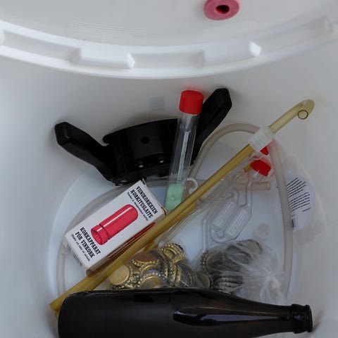 Osa uusia viinin ja oluen tekoon tarvittavia. Kruunukorkkeja n 210 kpl, viinipullonkorkkeja n 50 kpl, 2 alkoholimittaria, 2 olutpullon korkittajaa, 1 viinipullon korkittaja, lappoletku ym. Myös käymisastia löytyy samaan hintaan.