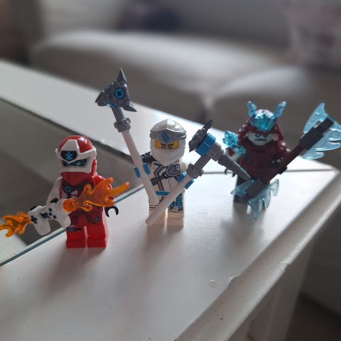 LEGO Ninjago rakennuskirja ja palikkasetti. Kirjassa on ohjeita useiden erilaisten Ninjago-aiheisten LEGO-mallien rakentamiseen, kuten ajoneuvoja ja pieniä rakennelmia. Kaksi palikkaa korvattu eri värisillä, esitetty kuvassa.