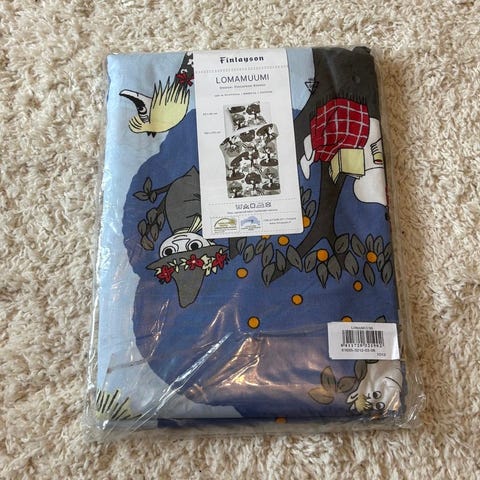 Uusi ja täysin käyttämätön Finlaysonin Puistomuumi pussilakanasetti, pussilakana 150x210, tyynyliina 55x65. Savuton ja lemmikitön talous.