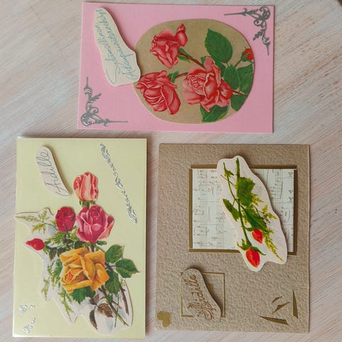 Kaksipuolisen kortit/Kuvat leikattu vanhoista korteista (1940-1980 luvuilta), samoin tekstit. Kpl/hinta.