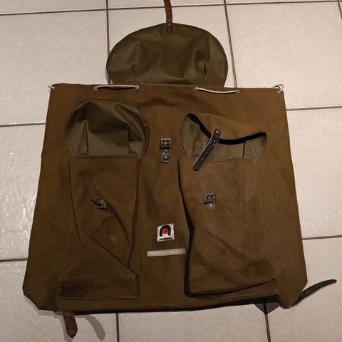 Tällä retrohenkisellä rinnalla tehty useita interrailmatkoja 1970-luvulla. Ehjä. Vetoketjut, nyörit ehjät, toinen etutaskun remmi poikki. Puhdaskin. Kellarissa pölyyntynyt. Kehikko metallia.