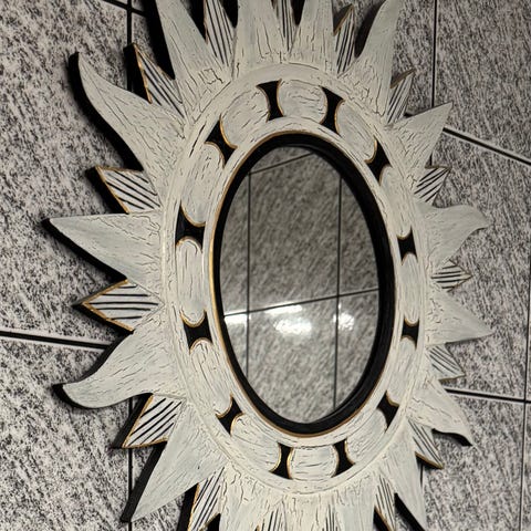 Seinäpeili, kehykset muovia, suht kevyt. Alkuperäinen takapahvissa ollut kiinnitys pettänyt, nyt laitettu rautalanka jolla pysyy.