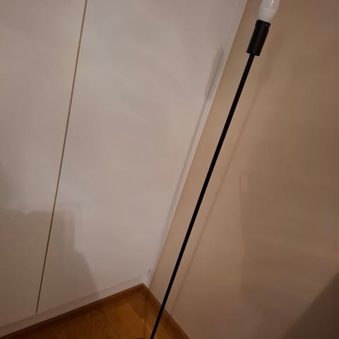Musta metallinen jalkalamppu, ei polttimoa mukana mutta testattu että toimii. Kuvussa hieman naarmuja